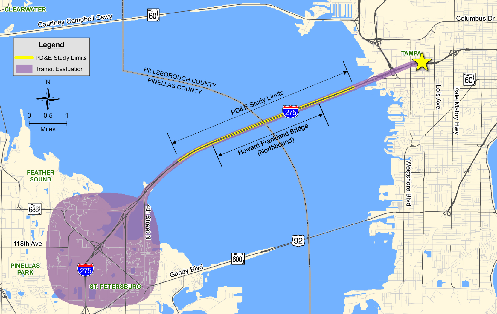 While the primary purpose of the PD&E study is to examine replacement of the bridge without increasing capacity, the transit study will examine how transit could be included in the bridge replacement construction. The transit study will examine engineering constraints and develop feasible alternatives to accommodate transit in the design of the replacement bridge, or determine if a new structure would be required. The study will review data gathered during the Pinellas County Alternatives Analysis (AA), which looked at providing premium transit service from Pinellas County to Hillsborough County. The study will also analyze data from the Westshore Multimodal Center Study. The Howard Frankland Bridge corridor must accommodate the appropriate transit provisions to connect all transit systems regionally.