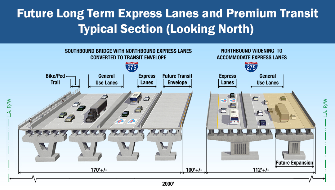 This led to proposing a recommended alternative for the new bridge to be on the west side of the southbound bridge. In addition, the alternative included the adding one express lane in each direction. This alternative was made available to the public in 2016. Just prior to the public hearing based on public input the FDOT decided to reevaluate this option.