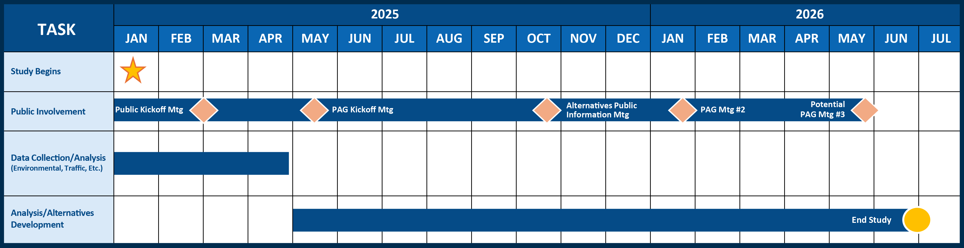 The I-175 Action Plan began in January 2025, and is planned to be completed in June\July 2026. The project activities include collecting information, defining a vision for the corridor, and developing corridor alternatives. Please see the project schedule below.