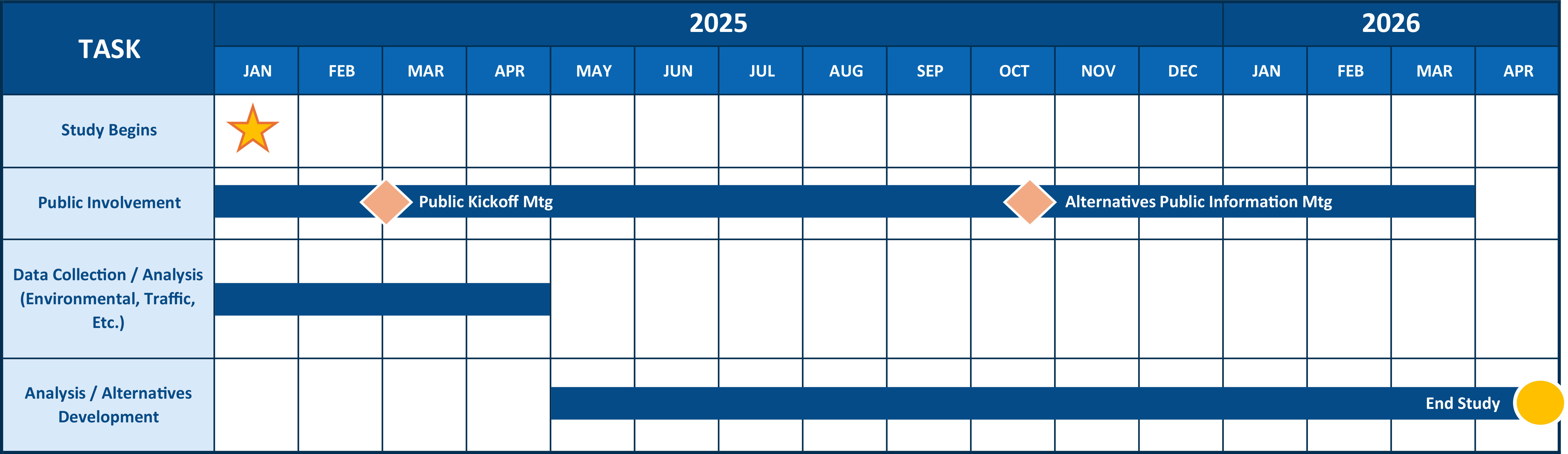 The I-175 Action Plan began in January 2025, and is planned to be completed in April 2026. The project activities include collecting information, defining a vision for the corridor, and developing corridor alternatives. Please see the project schedule below.
