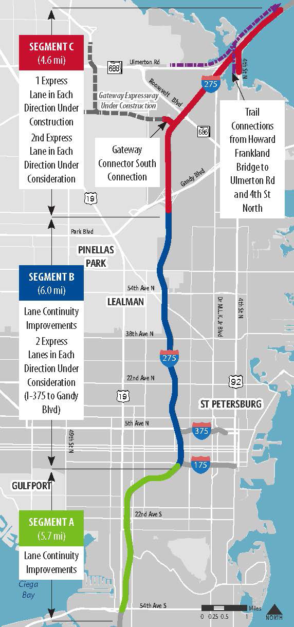 The current Design Change and Right-of-Way Re-evaluation evaluated impacts of further changes to the previously approved PD&E studies. The current re-evaluation assessed the impacts of accommodating the addition of two express lanes on I-275 in Segment B from north of I-375 to south of Gandy Boulevard and the addition of a second express lane in Segment C from Gandy Boulevard to north of 4th Street North. These proposed improvements would tie-in with planned improvements to the Howard Frankland Bridge (FPID 4229042 and 4229044).