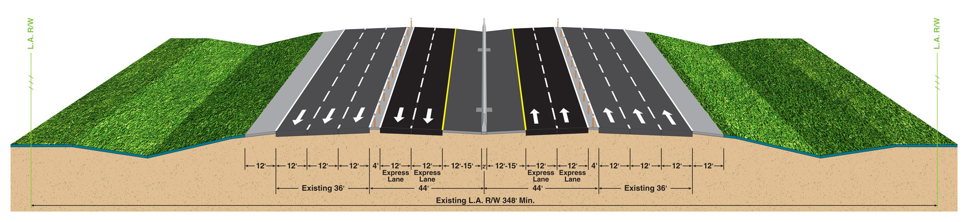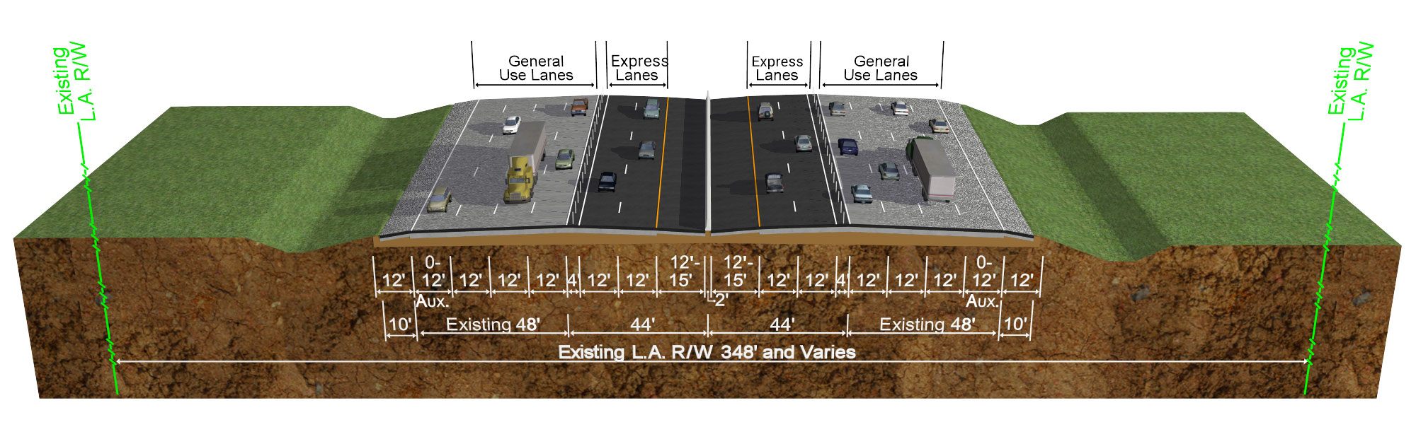 The Preferred Build Typical Section includes three 12-foot General Use Lanes (GULs), with a 12-foot auxiliary lane at various locations, in each direction. Inside shoulders will be 12 to 15-feet wide with outside shoulders being 12-feet wide. Adjacent to the GULs, within the median, will be two 12-foot ELs. The ELs will be separated from the GULs by a 4-foot buffer. A 2-foot concrete barrier will separate the two directions of travel.