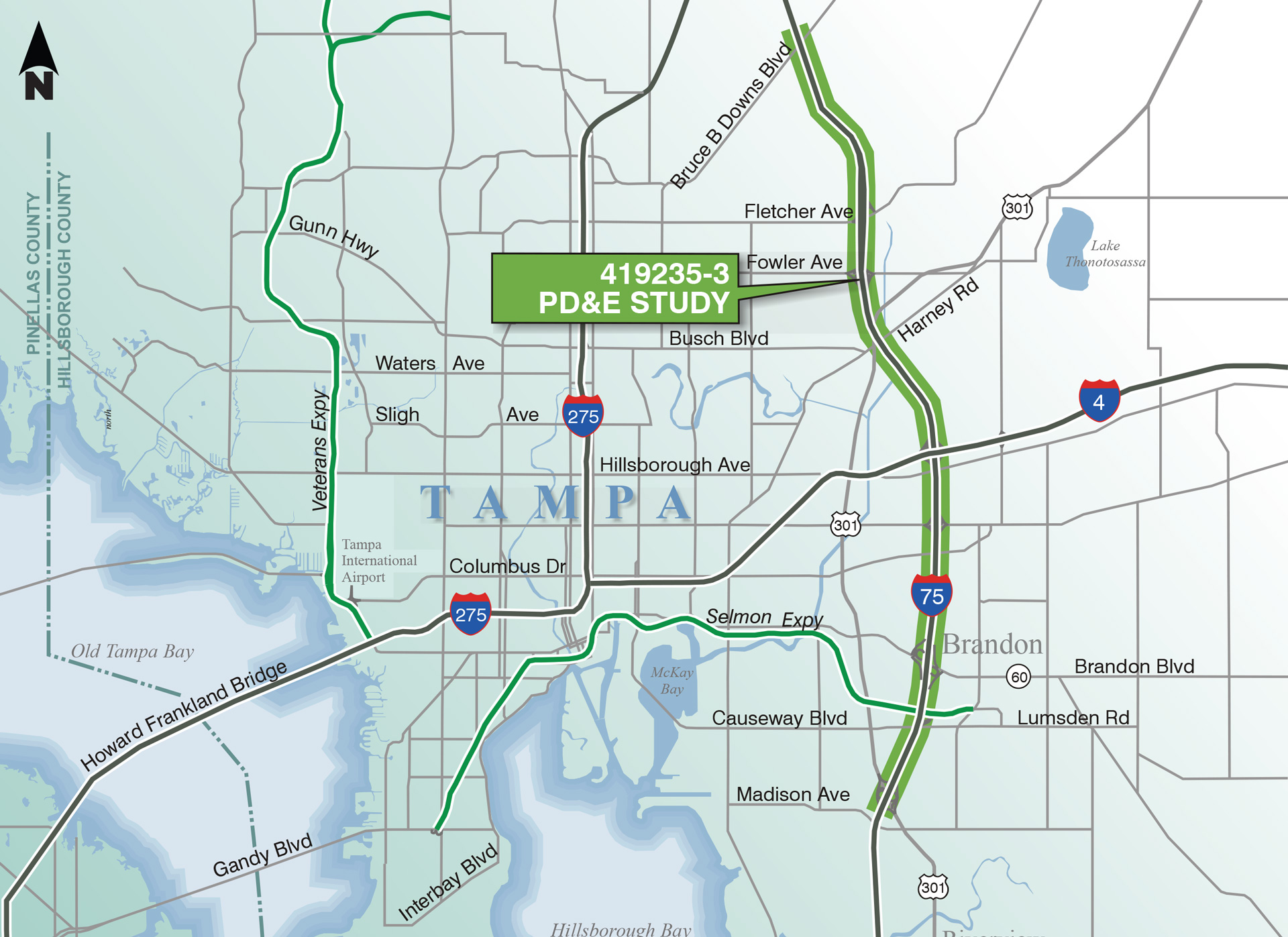 The Florida Department of Transportation (FDOT) has conducted a PD&E study, from south of US 301 to north of Bruce B. Downs Boulevard in Hillsborough County, to evaluate alternatives that improve the operational capacity of I-75. Currently, I-75 within the project limits is a 6-lane limited access facility with auxiliary lanes in each direction at various locations.