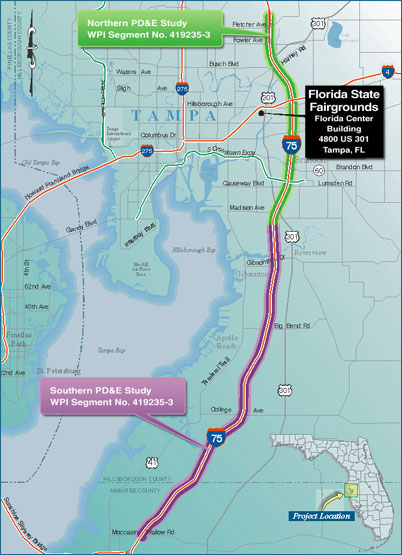 Maps, drawings, and other pertinent information depicting the project’s alignment and proposed improvements were available for public review from Thursday, April 15 through Tuesday, May 18, 2010, at the Florida Department of Transportation District Seven office. These documents were also on display at the Ruskin Branch Library, the Brandon Regional Library and the Temple Terrace Public Library.