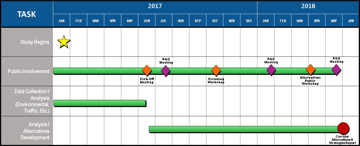 The SR 693 (Pasadena Avenue) study began in January 2017 and was completed in approximately 18 months. The project activities include collecting information, defining a vision for the corridor, and developing roadway improvement alternatives. Please see the project schedule below.