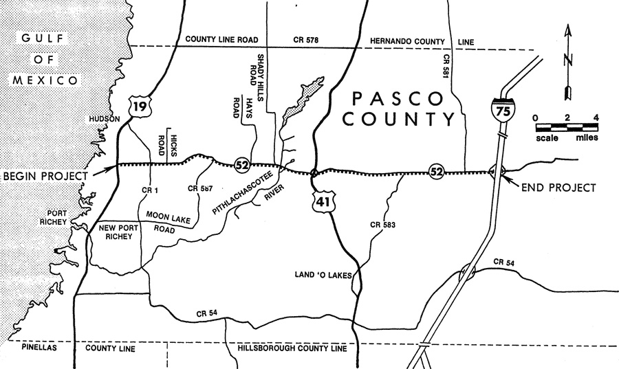 This project considers improvements to a section of State Road (SR) 52 from SR 55 (U.S. 19) to SR 93 (I-75) in central Pasco County on Florida’s west coast. The proposed action is to upgrade this 23.3-mile section of SR 52 from the existing 2-lane roadway to a multilane, divided highway. A 6-lane, divided urban cross section is proposed from U.S. 19 to County Road (CR) 587 (Moon Lake Road), and a 4-lane rural cross section is proposed from Moon Lake Road to I-75. The bridge over Bear Creek, located approximately 1.5 miles east of U.S. 19, will be replaced as part of this project. Other culverts and box culverts located within the project limits will be replaced or widened as warranted. These highway improvements will provide adequate capacity through the 2010 design year.