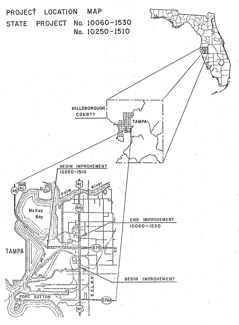State Road 676 (22nd Street Causeway Boulevard) and State Road 45 (US 41) are vital arterial highways which serve the City of Tampa located in Hillsborough County. This negative declaration analyzes various engineering and environmental factors considered in defining the specific location and design alternates. The improvement limits for State Road 676 are from the south approach of the McKay Bay Bridge east approximately 1.1 miles to State Road 45 (US 41). The improvement limits for State Road 45 (US 41) are from the 36th Avenue South intersection north approximately .9 miles to the 23rd Avenue South intersection. State Road 676 is on the State of Florida Primary and the Federal Secondary Highway Systems. State Road 45 (US 41) is on the State and Federal Primary Highway Systems. The 1973 Federal Highway Act called for realignment of the Federal Aid System by July 1, 1976, and these designations could change.