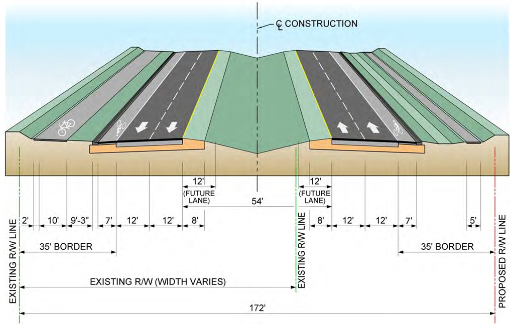 The Preferred Build Alternative includes widening US 301 to a 4-lane divided roadway and consists of two typical sections. Both typical sections hold the existing western right-of-way line and expand the project corridor to the east. The first typical section begins south of the future SR 56 intersection and ends at Chancey Road. This proposed roadway segment will have two 12-foot travel lanes in each direction separated by a 54-foot wide grassed median, two 7-foot paved shoulders (also buffered bicycle lanes), as well as a 5-foot sidewalk along the eastern side and a 10-foot shared use path along the western side. In the future, this roadway segment could be expanded to 6 lanes by adding two lanes on the inside and reducing the median width.