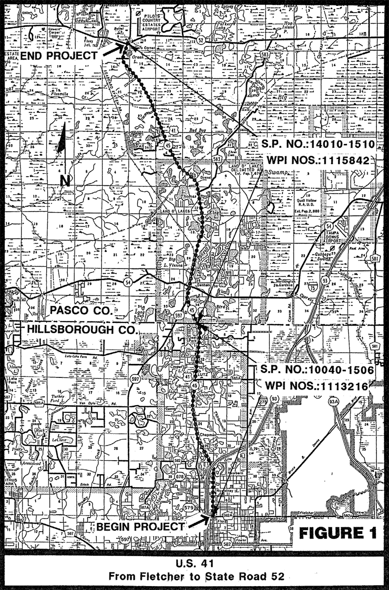 The project involves an 18.5 mile segment of U.S. 41 in Hillsborough and Pasco Counties extending from the vicinity of Fletcher Ave. in Tampa, Hillsborough County to SR 52 in central Pasco County. The highway is to be improved from the existing two-lane rural facility to a divided multi-lane facility. The existing roadway is predominantly 24 to 28 feet wide with 6 to 10-foot grassed shoulders. Areas of high traffic volumes and high accident rates have been widened to provide a safer facility. The existing right-of-way throughout the project limits varies from 66 to 200 feet.