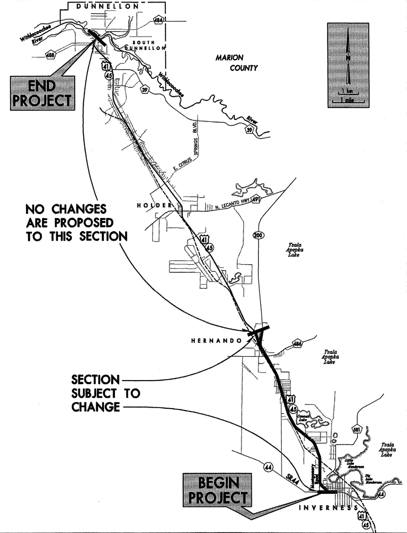 The proposed project, located within the city of Inverness and unincorporated areas of Citrus County, involves widening US 41 between SR 44 and the vicinity of CR 488. The total project length is approximately 25 km (15.6 mi). This reevaluation studies preliminary design changes from SR 44 to SR 200, a distance of approximately 10.3 km (6.4 mi).