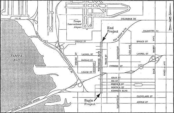 The existing typical section from Kennedy Boulevard to I-275 is urban and consists of three, 3A-meter (12-foot) lanes in each direction of travel. A 4.9-meter (16-foot) raised median separates opposing travel lanes. A 1.5-meter (five-foot) sidewalk is provided along both sides of the roadway separated from the back of curb by a 0.6-meter (two-foot) grassed strip.